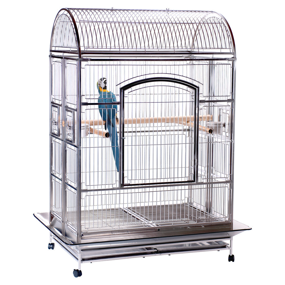 When size matters, this stainless steel pet bird cage towers above the rest. It's the roomiest dome top we offer, designed with full-size Macaws and large Cockatoos in mind. Generous interior keeps wings and long tail feathers intact and looking beautiful. It's the ultimate in cage safety, security, and convenience, with all-metal construction, corner welded panels and doors, and easy glide locking casters. Ready to assemble - requires no tools for easy installation.