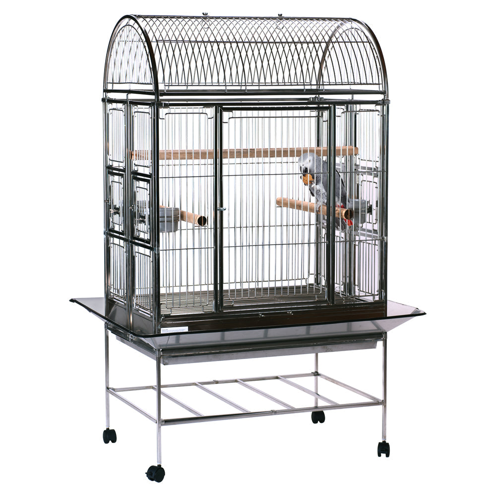 Uncompromising quality is evident in this unique cage design. Has all-metal construction with corner welded panels and doors, removable seed guard, 4 removable feeding doors and parrot-proof, self-locking doors. Designed to maintain a clean and safe environment. The arched top adds interior space and maneuvering room. Ready to assemble - requires no tools for easy installation.